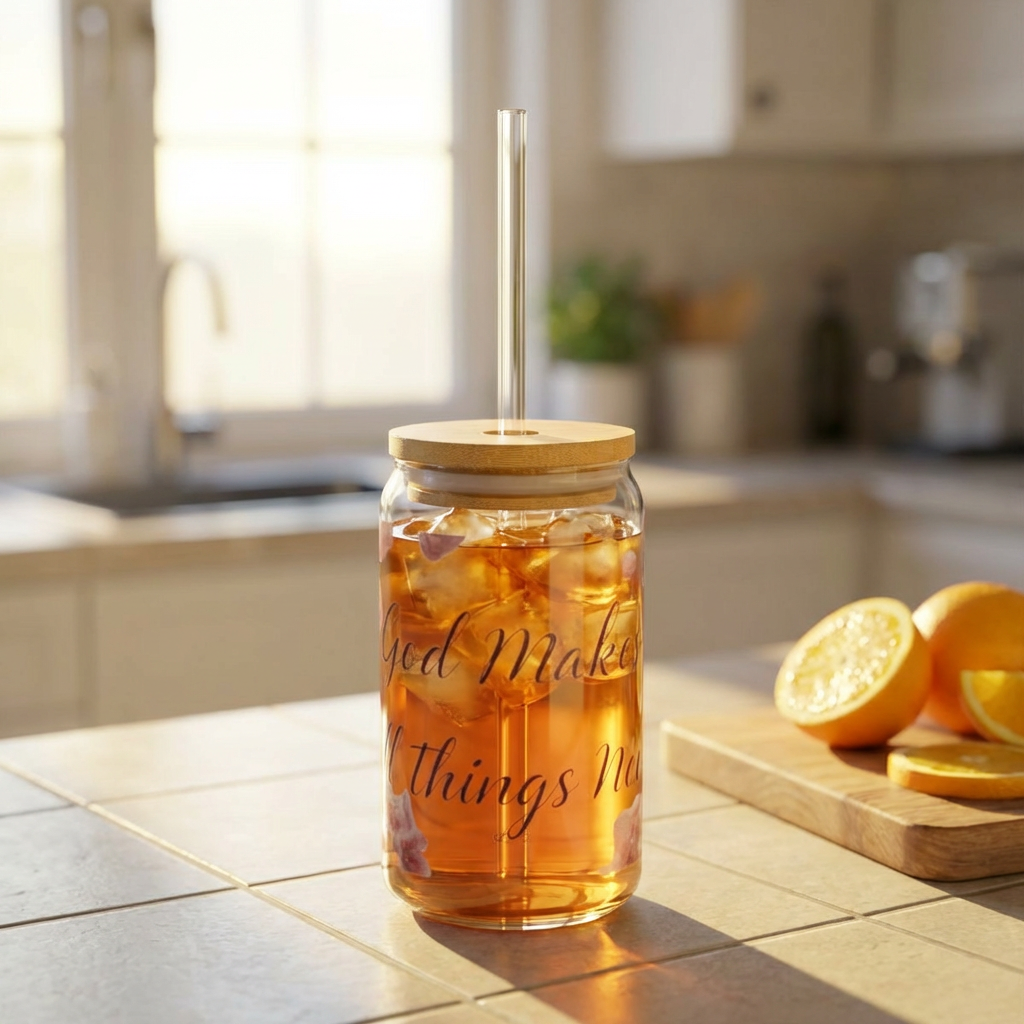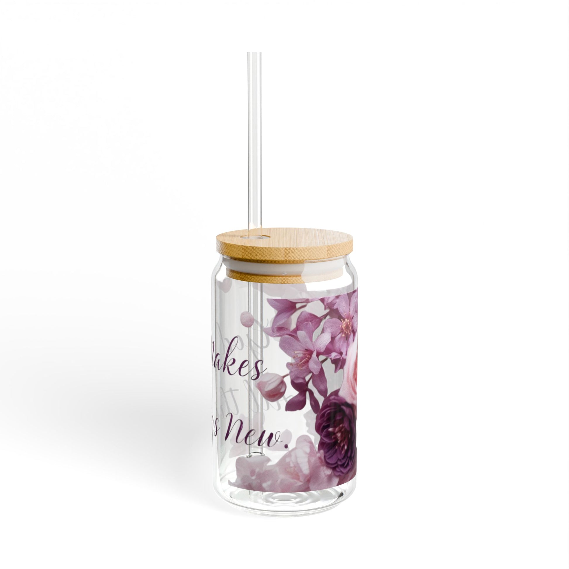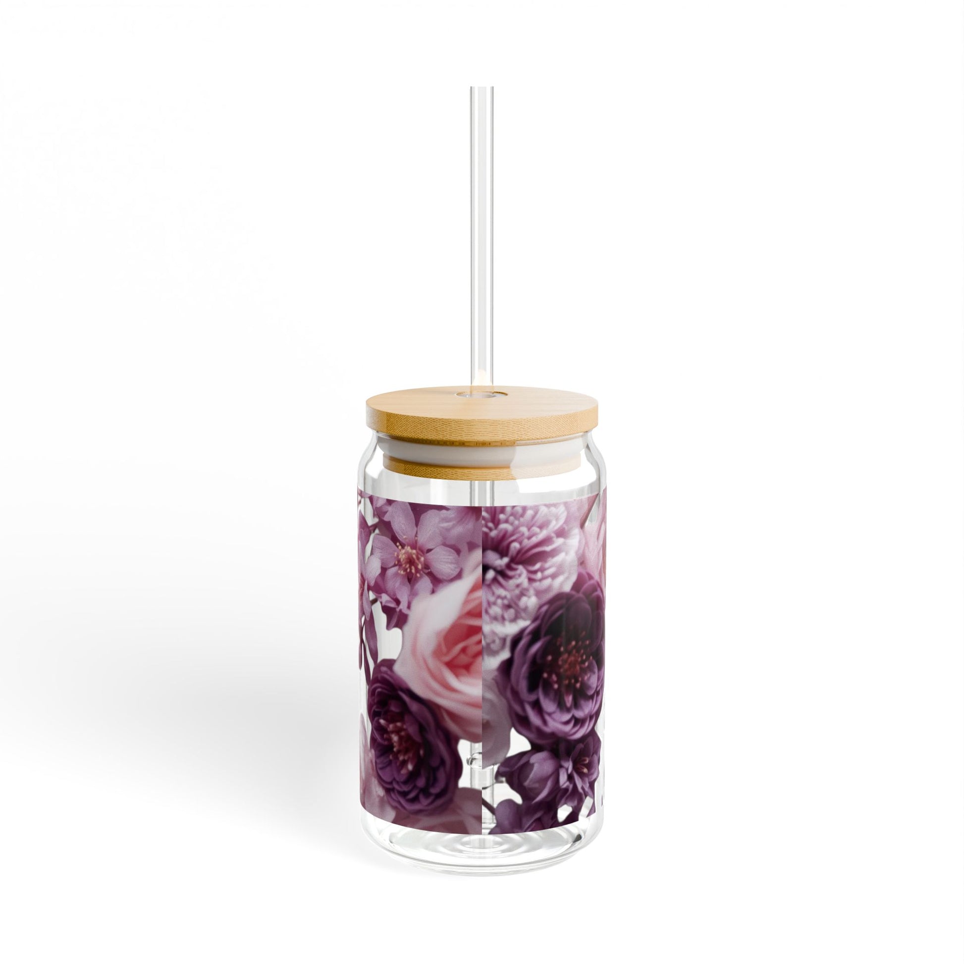 This 16oz sipper glass brings quiet, floral charm to everyday drinks. Clear tempered glass shows off delicate mauve and plum blooms that curl around soft script, while the bamboo push lid and clear Tritan straw keep sipping simple and spill-resistant. It sits comfortably in hand and looks at home on a sunlit windowsill, a cluttered desk, or beside a cozy reading chair. Choose the lid-and-straw option when you want a more finished, portable cup; skip them when you prefer an open glass for kitchen use. Hand wash only to keep the colors crisp and the bamboo lid looking fresh.