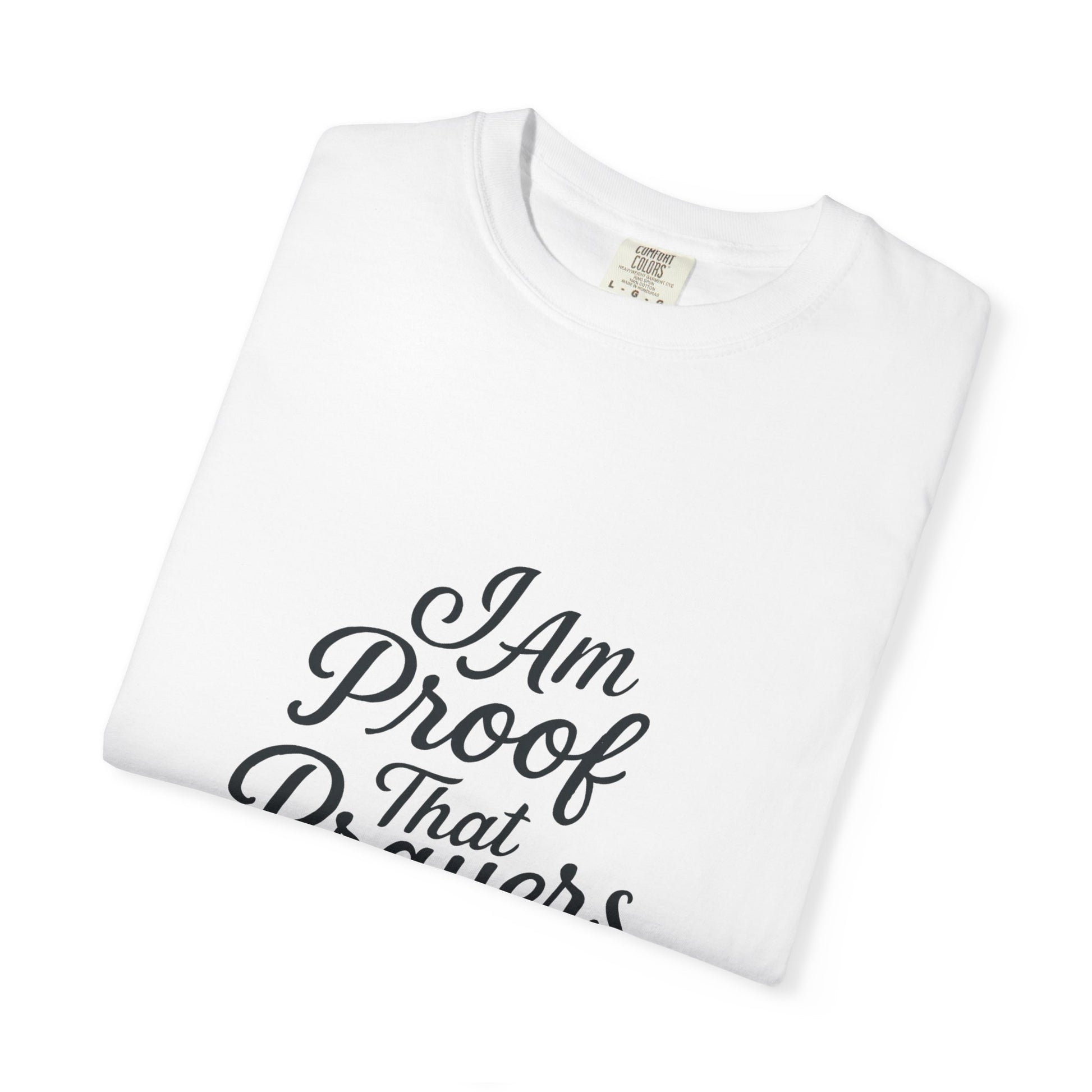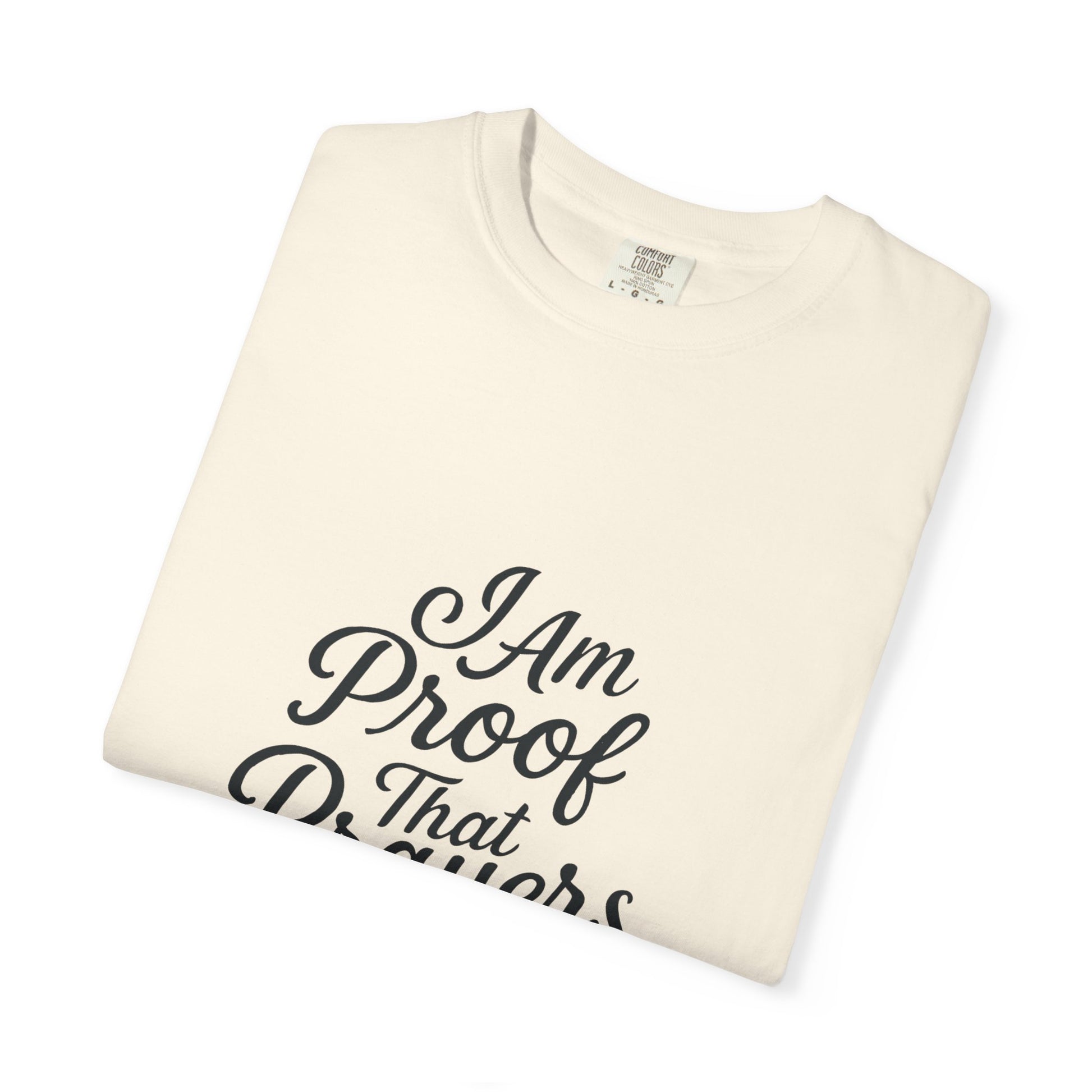 Wear your testimony with confidence in the I Am Proof That Prayers Work T-shirt — a powerful declaration of faith and answered prayer. This design features elegant script lettering that flows across a soft, high-quality fabric, creating a look that’s both inspiring and stylish. Whether you’ve overcome trials, witnessed miracles, or simply want to share your faith, this shirt is a reminder that God still moves. Comfortable, bold, and faith-filled — it's perfect for everyday wear or gifting to someone with a powerful story.