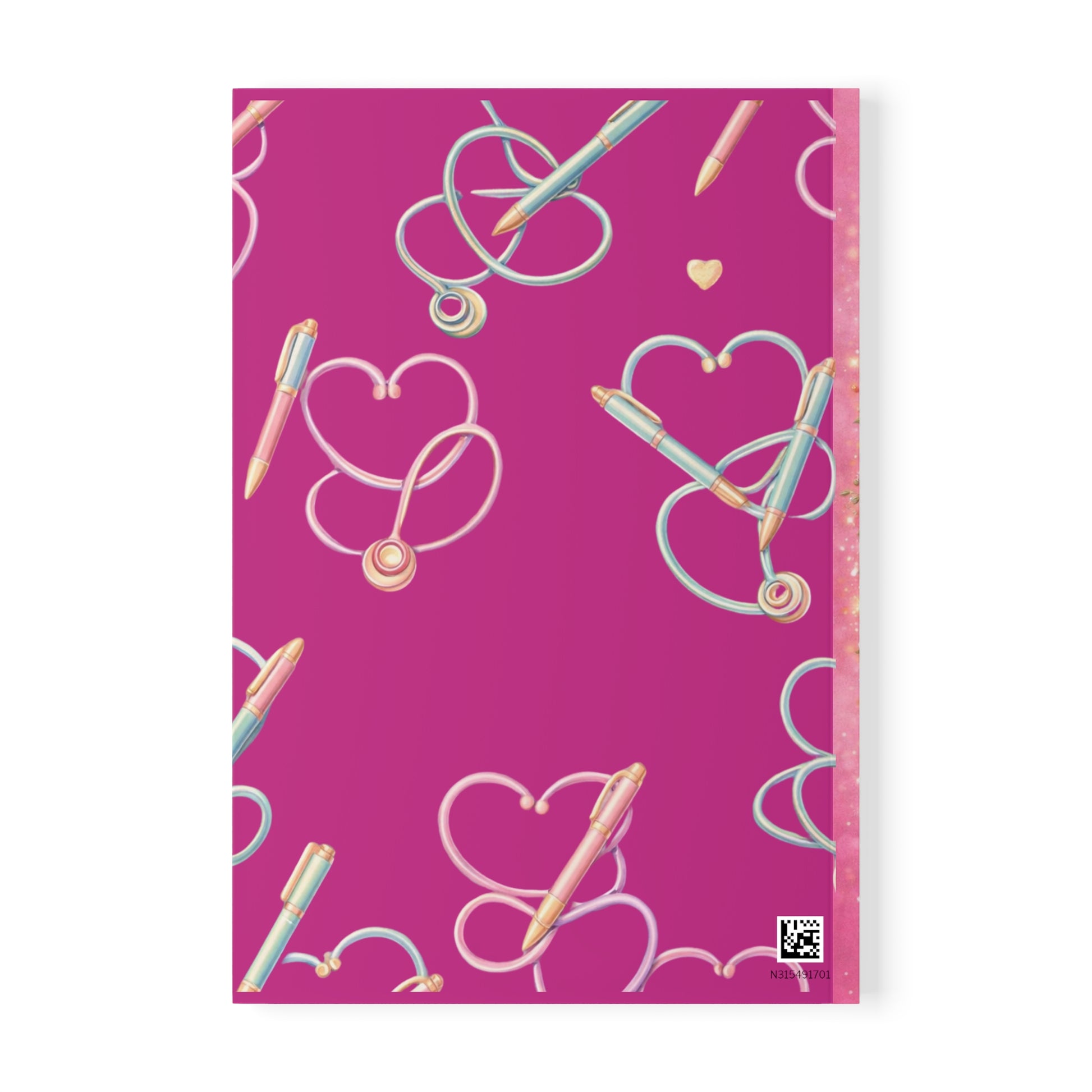 A cheerful A5 softcover notebook crafted for nurses and caregivers who carry compassion in every shift. The matte-laminated cover shines with warm pinks, floral accents, a cross and stethoscope motif, and a gentle reminder of faith and service. Inside, 150 lined pages of smooth 90gsm paper lie flat thanks to perfect binding — making note-taking during rounds, study sessions, or quiet moments effortless. Compact and lightweight, it slips into a tote or scrubs pocket for quick access to medication notes, shift reflections, or gratitude lists. The vibrant cover print wraps front and back for a cohesive, uplifting look.