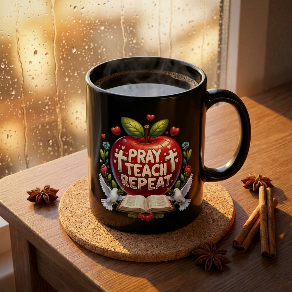 Start your morning with a quiet moment of purpose. This glossy black ceramic mug pairs bold, vibrant artwork with a message that speaks to teachers of faith: Pray. Teach. Repeat. The apple motif, open book, and gentle doves create a warm, chapel-like calm that settles into your hands as you sip. It’s designed to sit on a classroom desk or a kitchen table, holding coffee between lesson planning, prayer, and the small routines that matter. Bright printing holds up wash after wash, and the C-shaped handle feels familiar and steady in your grip.