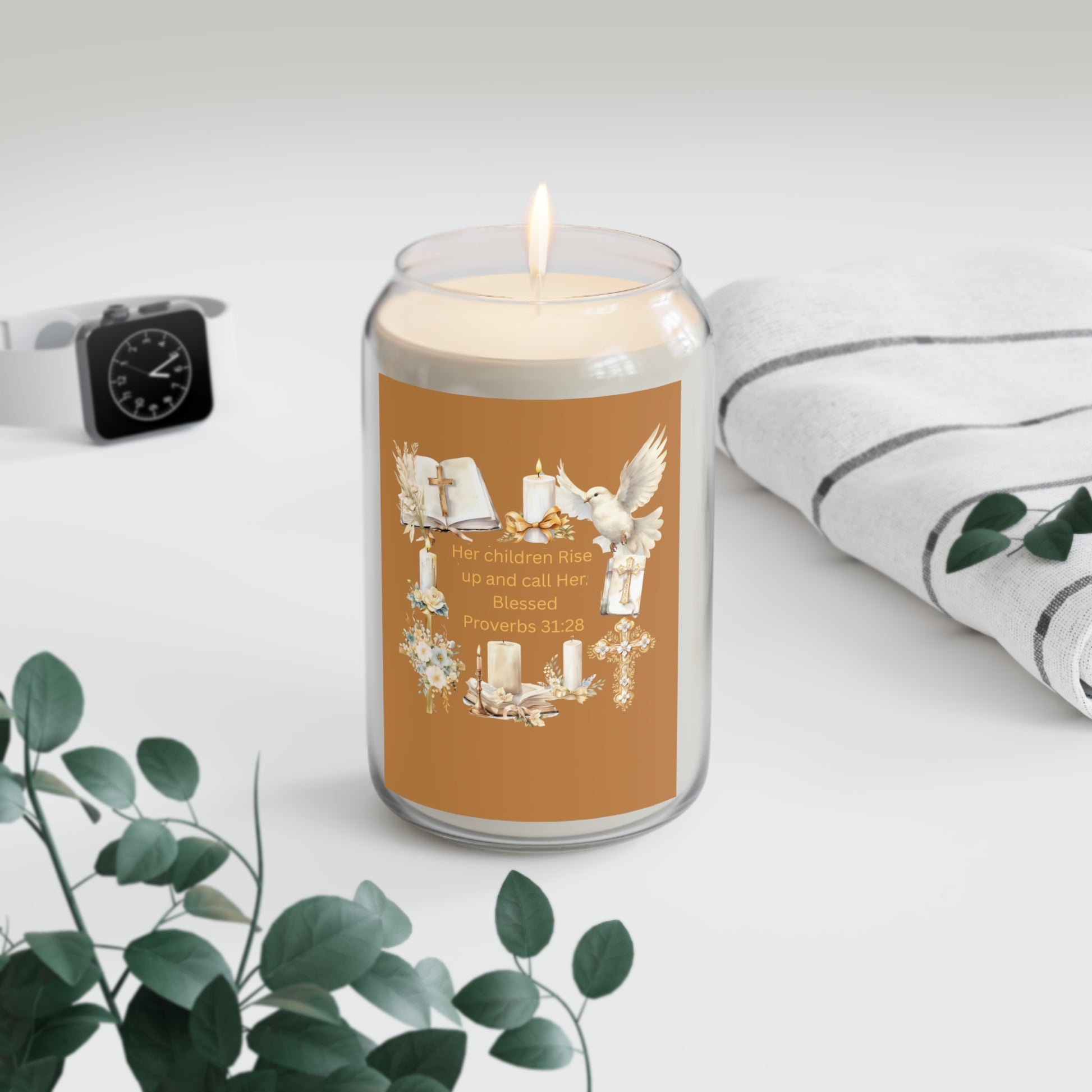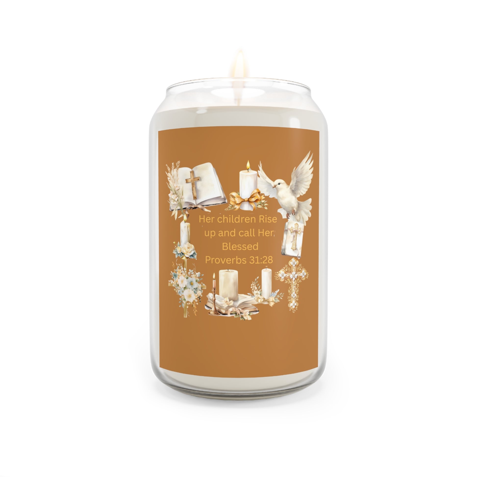 Fill your space with peace, warmth, and the beauty of God’s Word through the She Is Blessed Proverbs 31:28 Faith Candle.