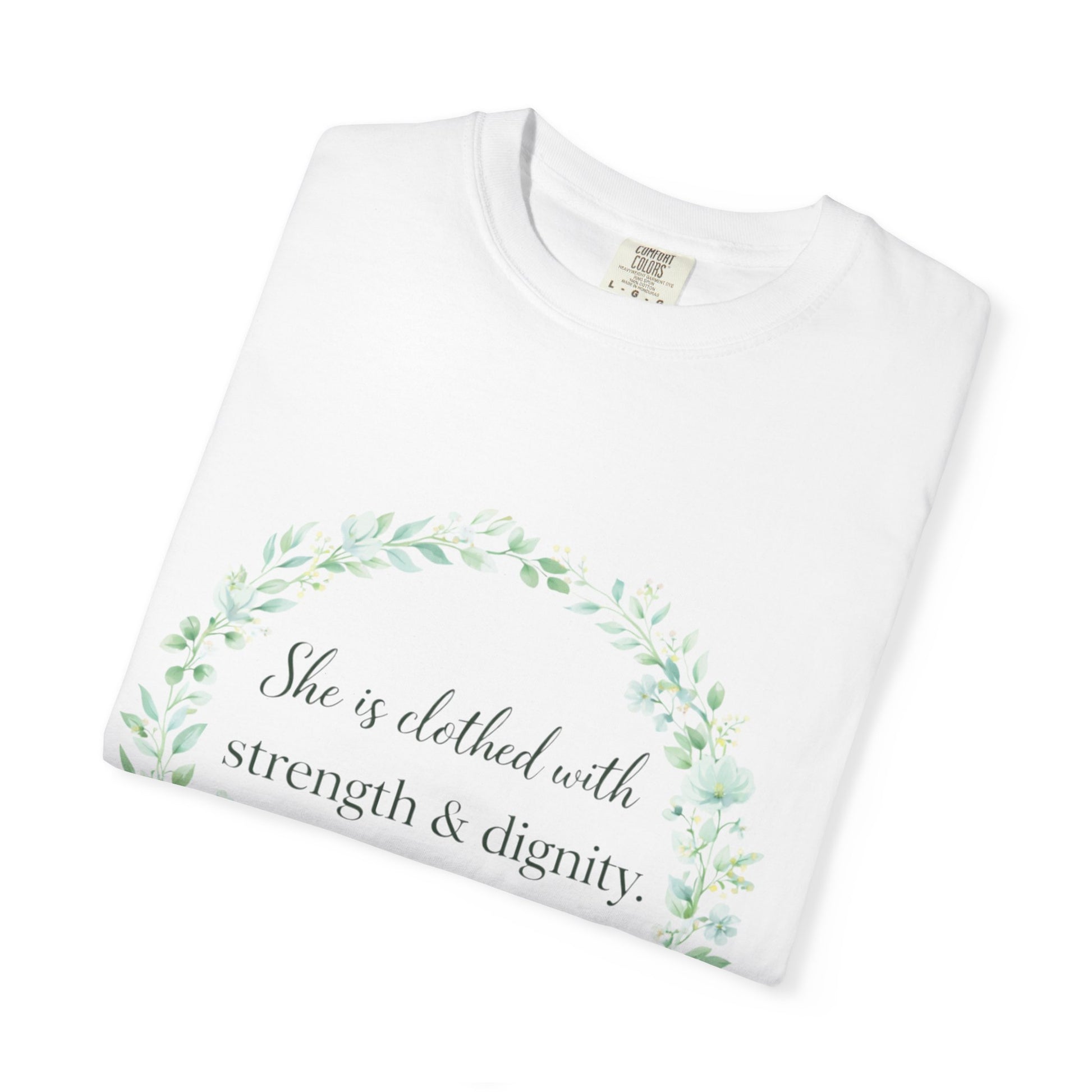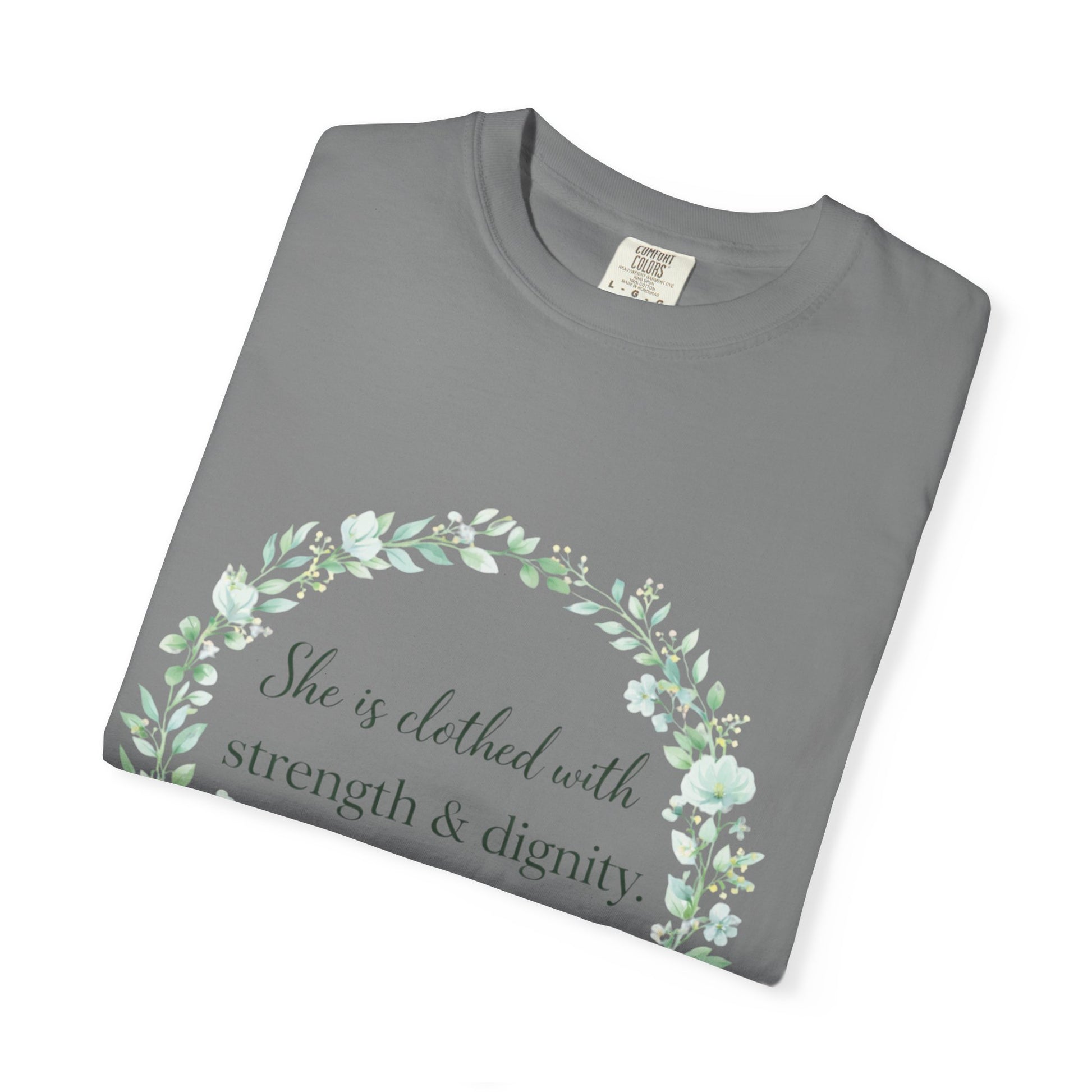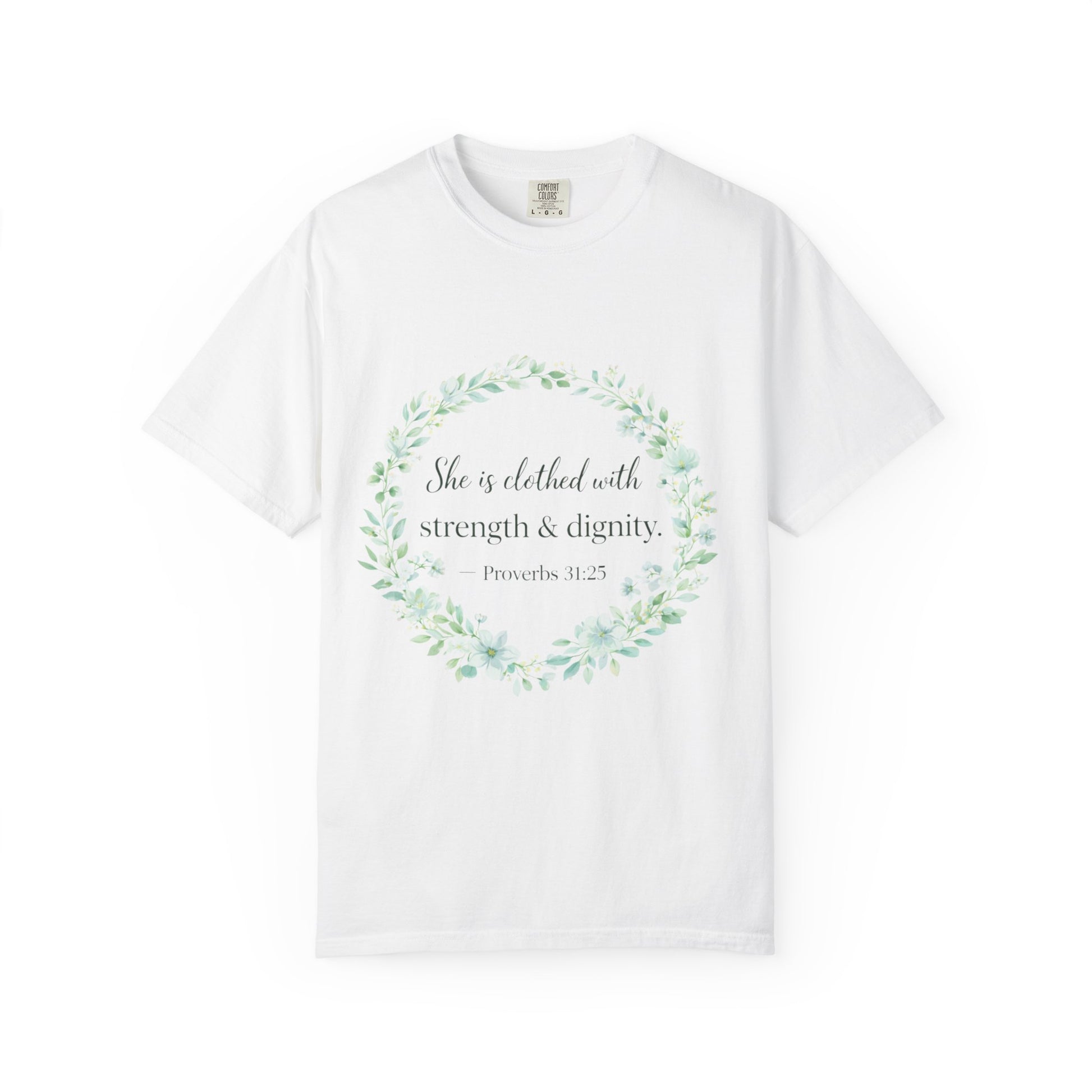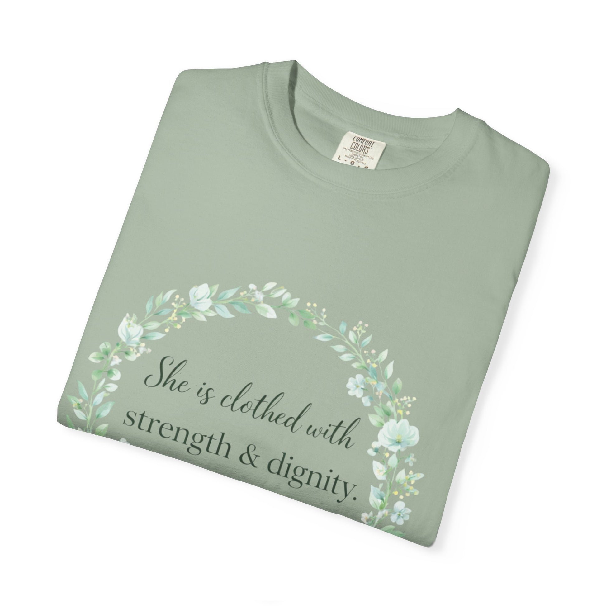 Wear a beautiful reminder of God-given strength, grace, and confidence with the Clothed with Strength & Dignity Proverbs 31:25 Faith Shirt.