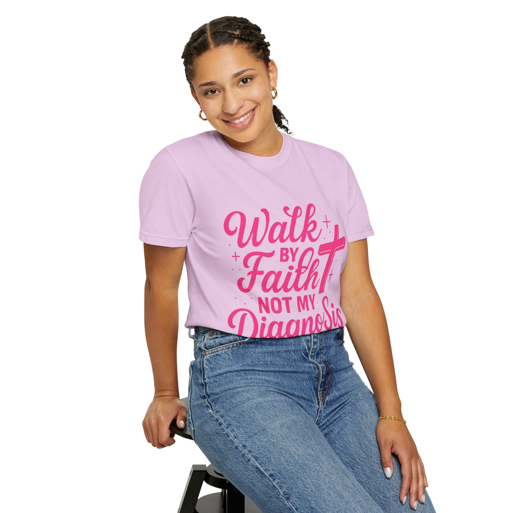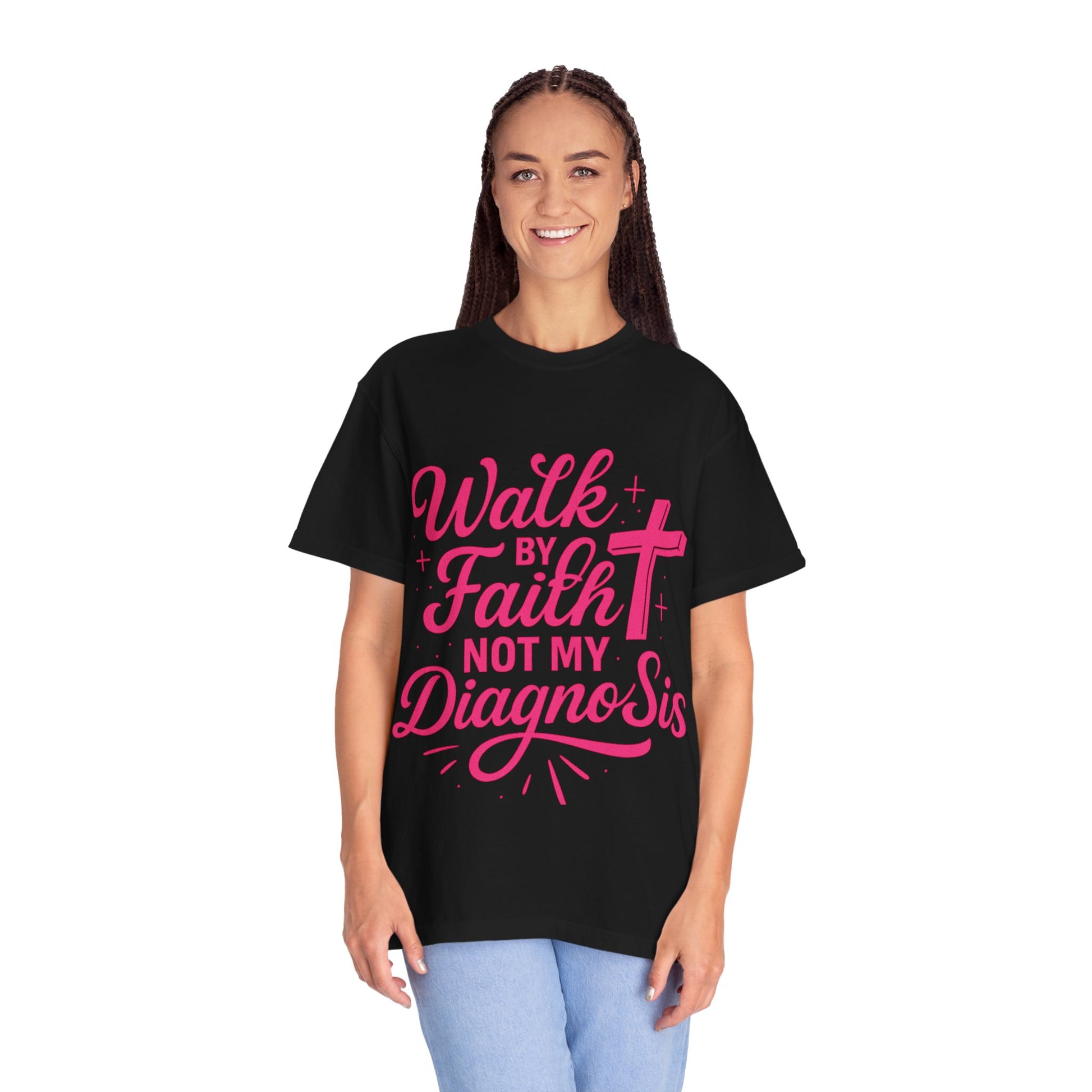 Declare your faith louder than any report with this bold and empowering shirt. Featuring the powerful phrase “Walk by Faith, Not My Diagnosis,” this design is for warriors who choose trust over fear and purpose over pain. Whether you're walking through healing, supporting a loved one, or standing on God's promises this shirt is a reminder that your diagnosis does not define you your faith does.